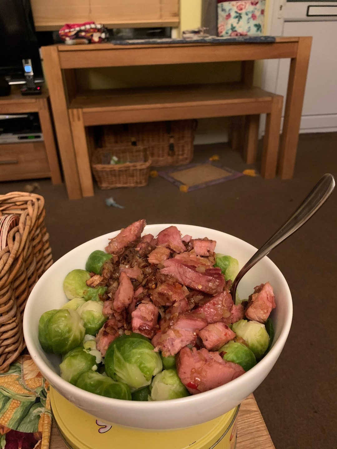 - Tip the pork and onion mix onto the sprouts and stick your fork into the centre